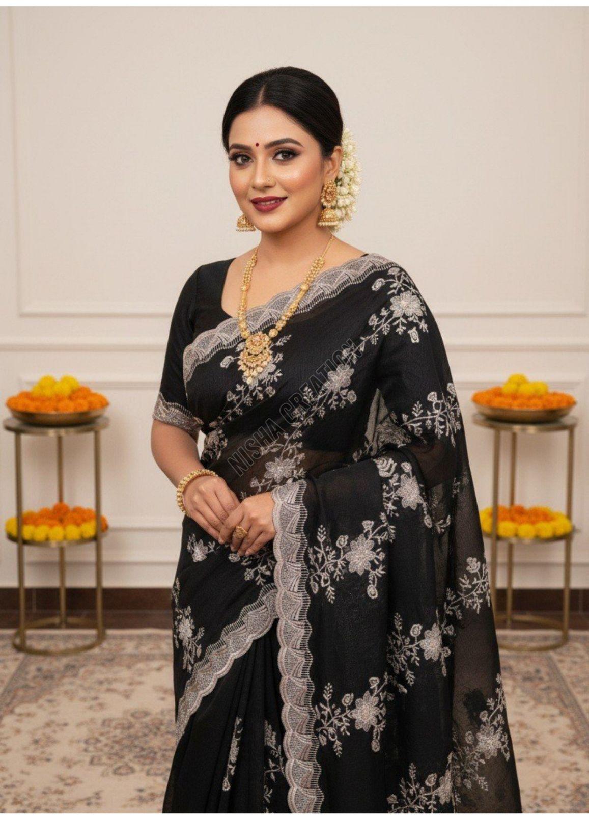 As a leading Black Embroidery Silk Saree Manufacturer, we specialize in creating elegant sarees that reflect luxury, tradition, and fine craftsmanship. Our black silk sarees are crafted from premium-quality silk and enhanced with intricate embroidery that adds richness and sophistication. Each design is thoughtfully developed to suit weddings, parties, and festive occasions. With a strong focus on quality, durability, and stylish detailing, we offer a wide range of patterns and finishes. Our manufacturing process ensures flawless drape, superior comfort, and high standards, catering to both domestic and international markets.
